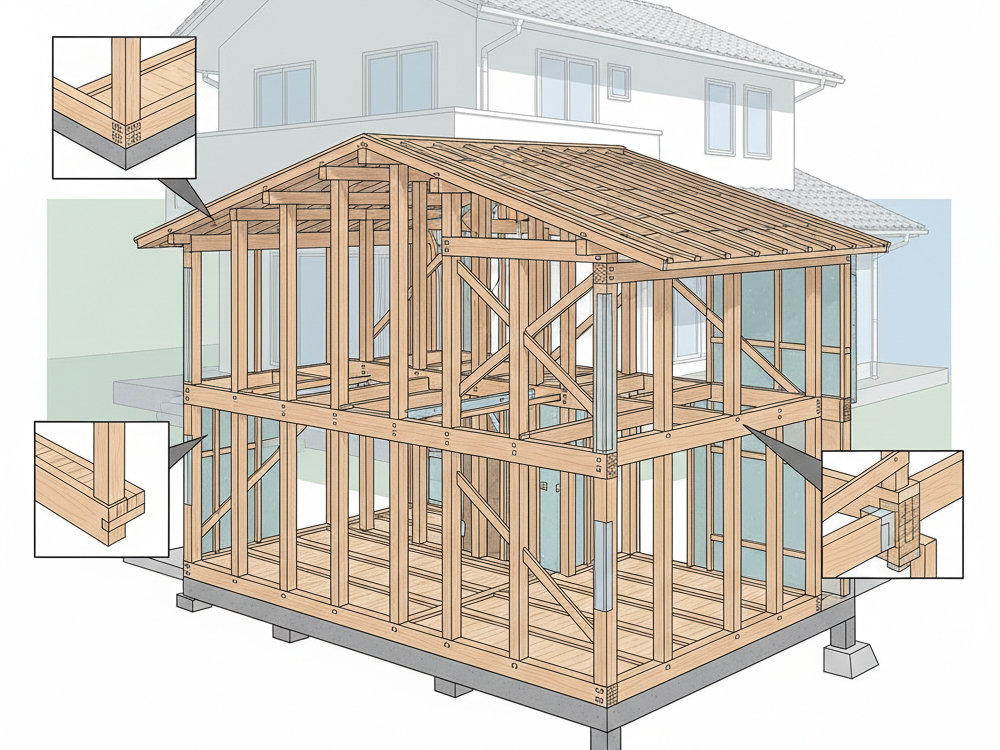 木造軸組工法とは、柱と梁で建物を支える日本の伝統的な工法で、「在来工法」とも呼ばれます。