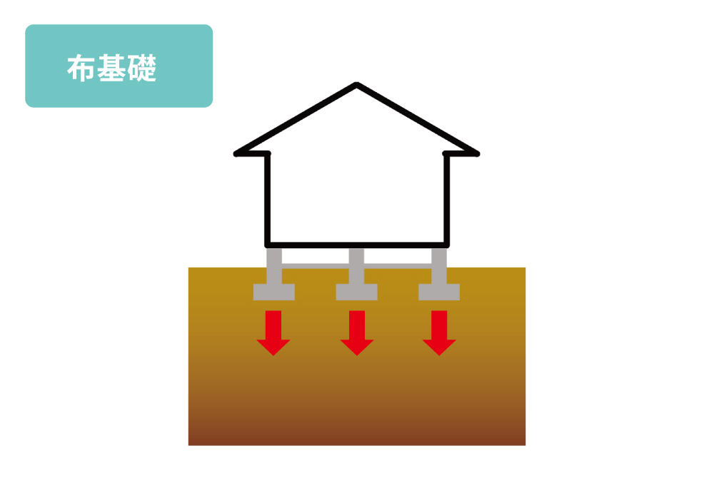 荷重が集中する部分を重点的に支えます。ベタ基礎よりもコンクリート使用量が少ないため、コストを抑えることが可能です。