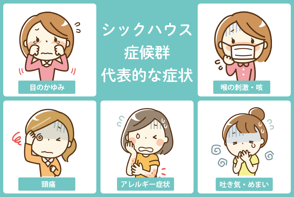 シックハウス症候群の症状は人によってさまざまですが、一般的には目や喉の刺激、頭痛やめまいなどの体調不良が起こることがあります。特に小さなお子様や高齢者、体質的に敏感な方は影響を受けやすいといわれています。
