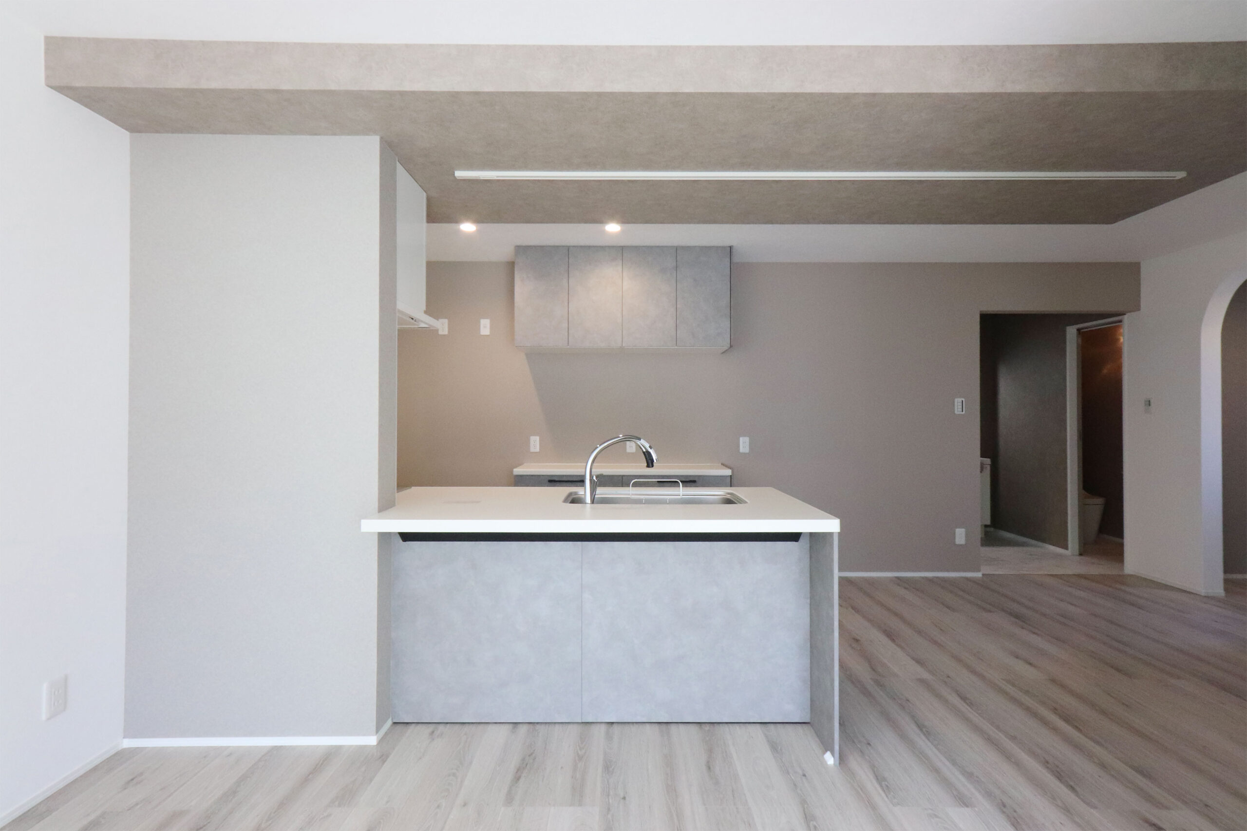 落ち着いた色味が空間全体にやわらかな表情を与え、自然と高級感が漂う上品なキッチンに仕上がりました。