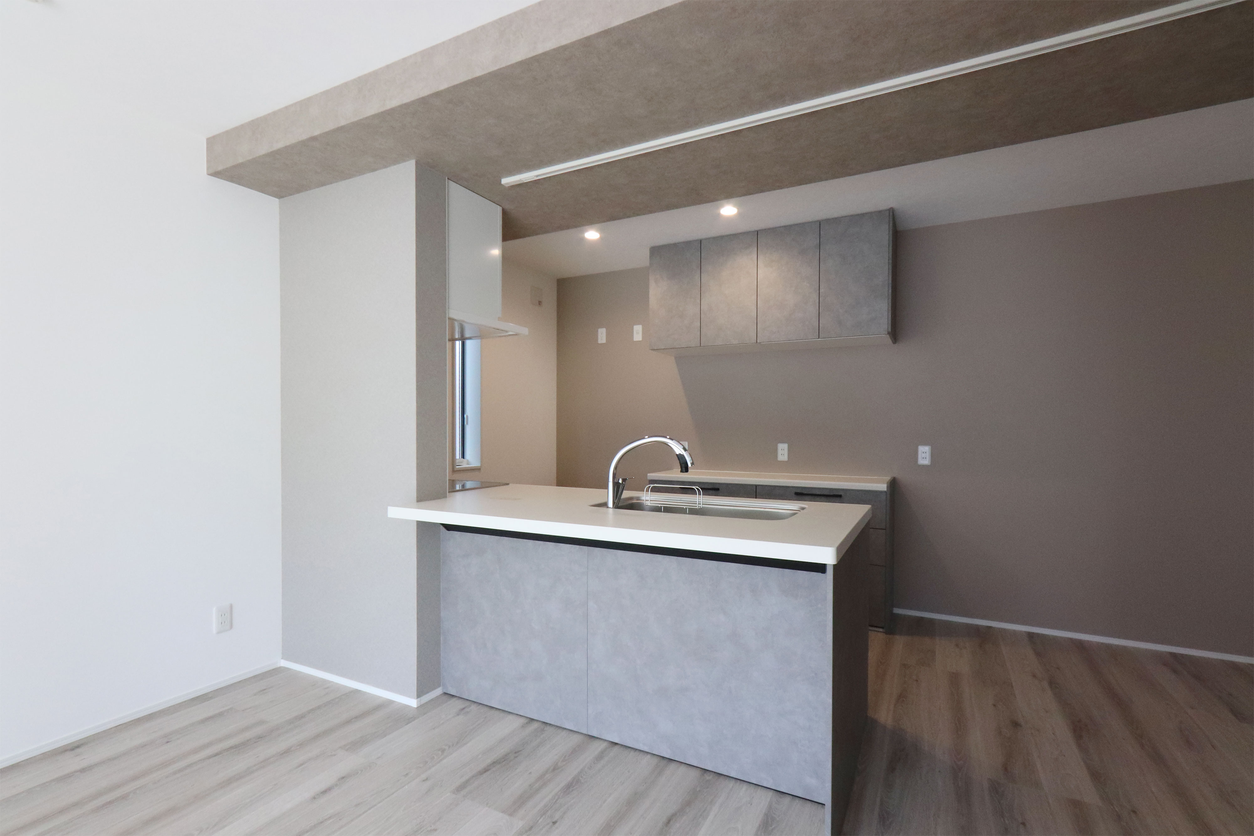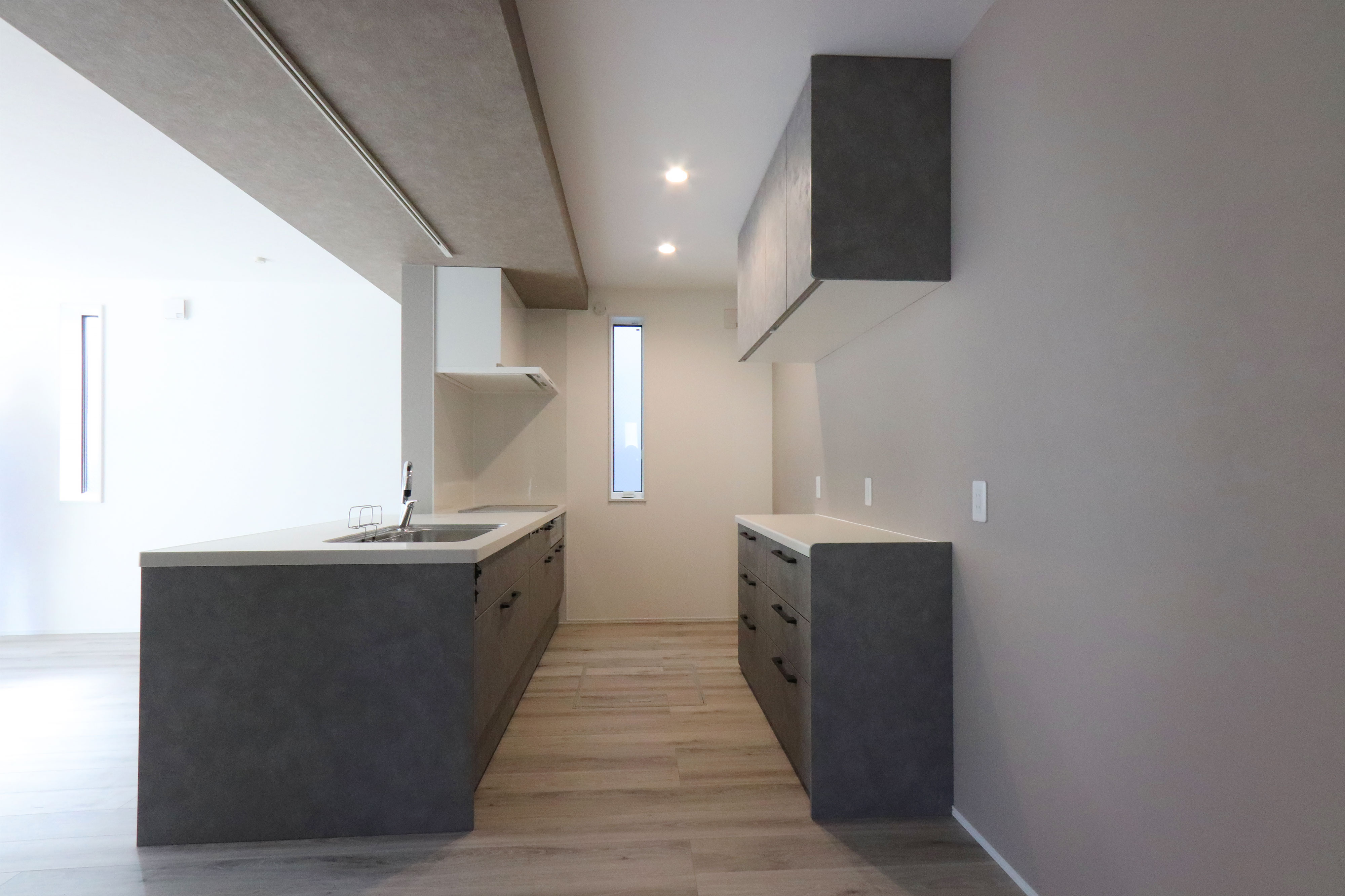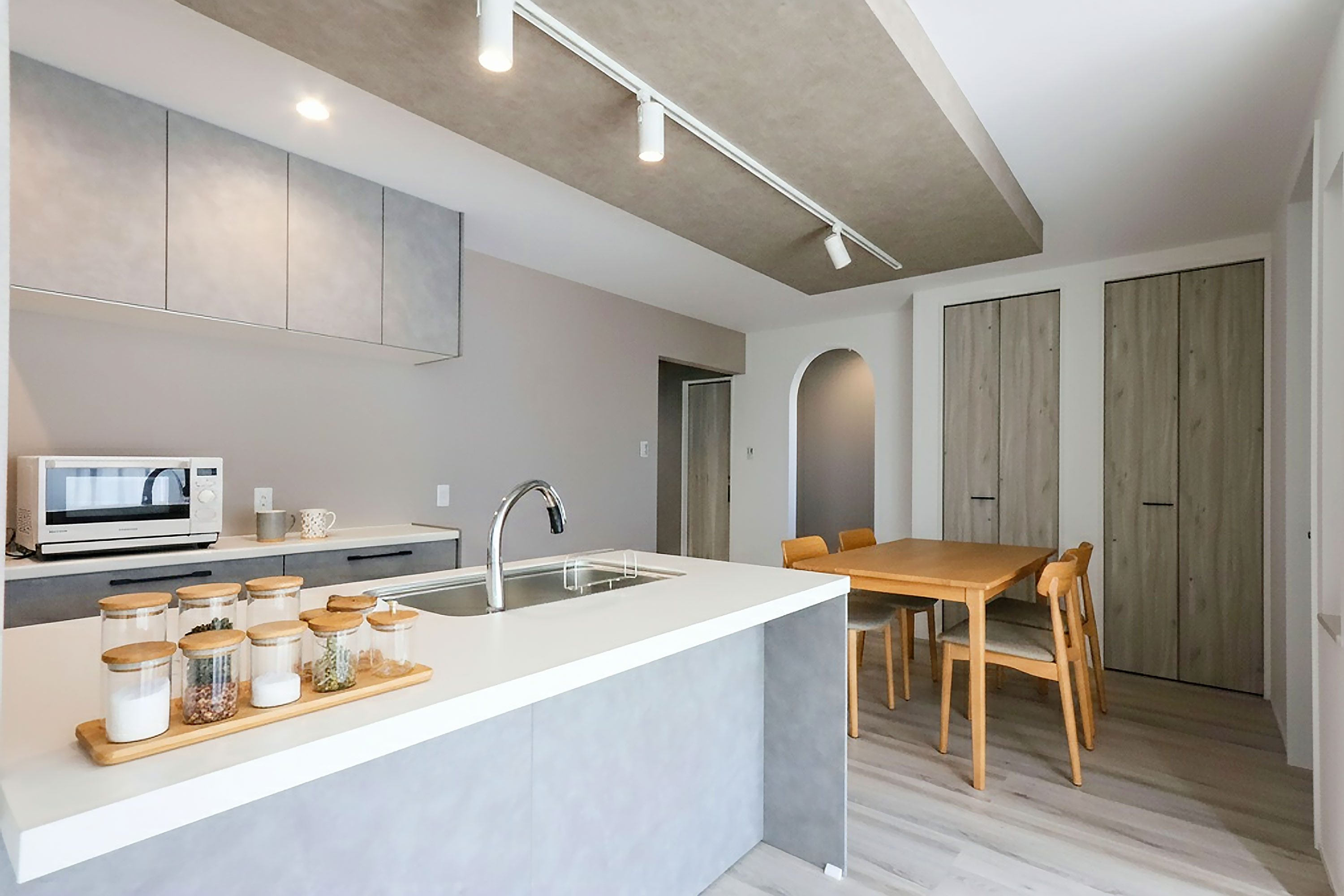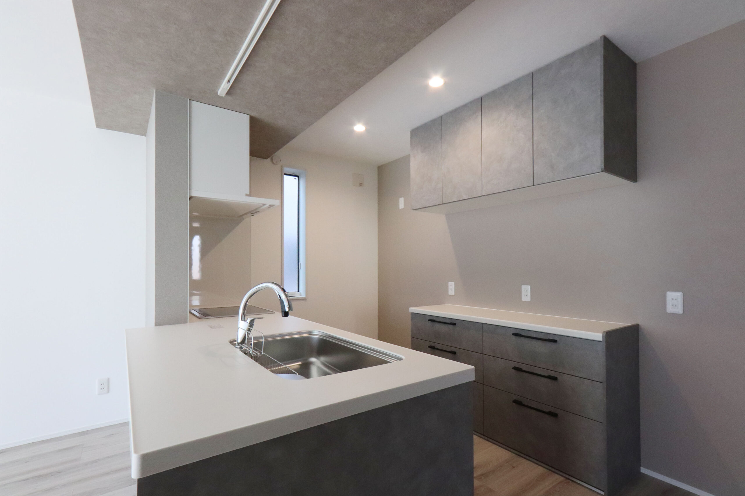 キッチンの扉には、洗練されたグレージュスタッコカラーを採用されました。