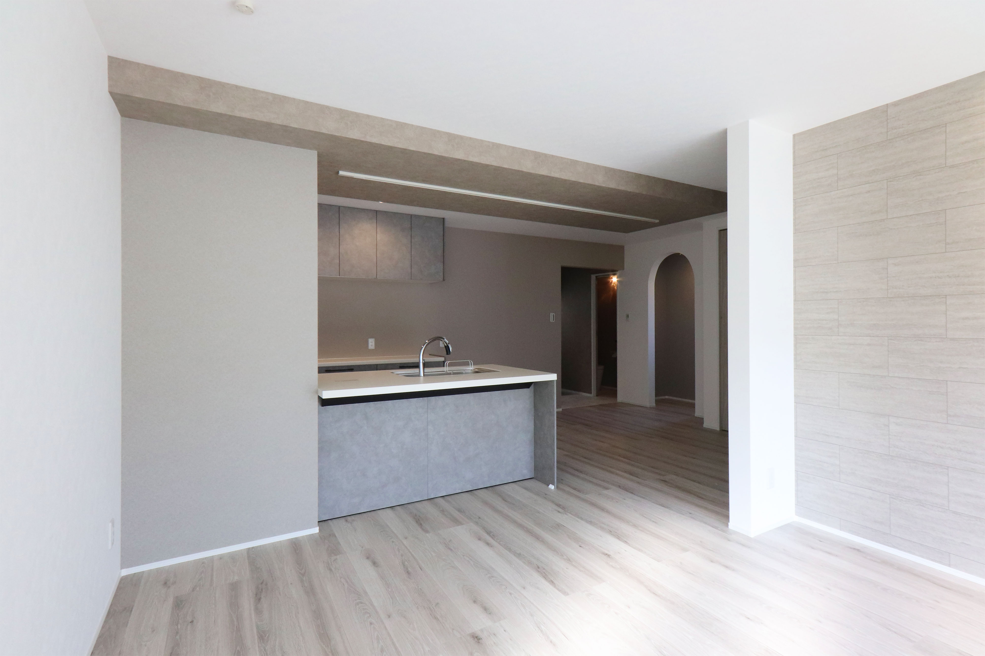 壁紙にはシックなグレーを取り入れ、落ち着いた色合いが洗練された印象を添えています。