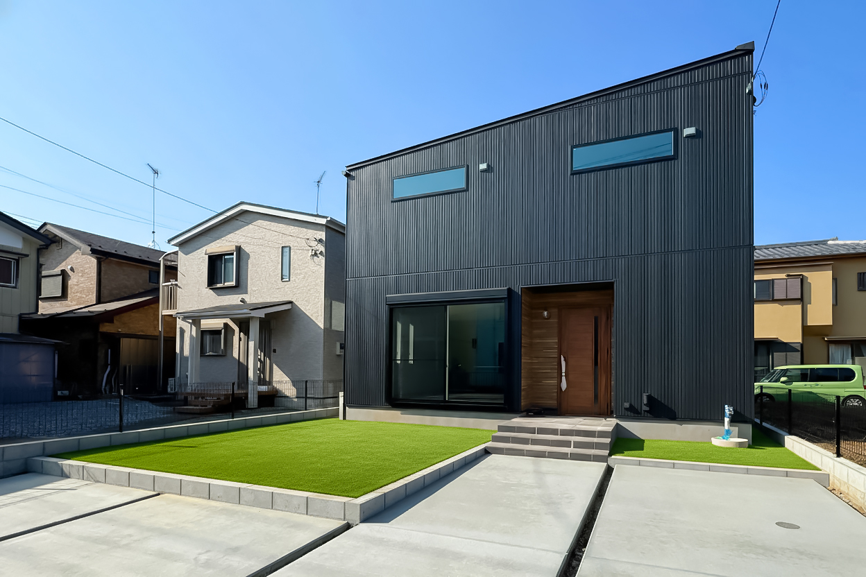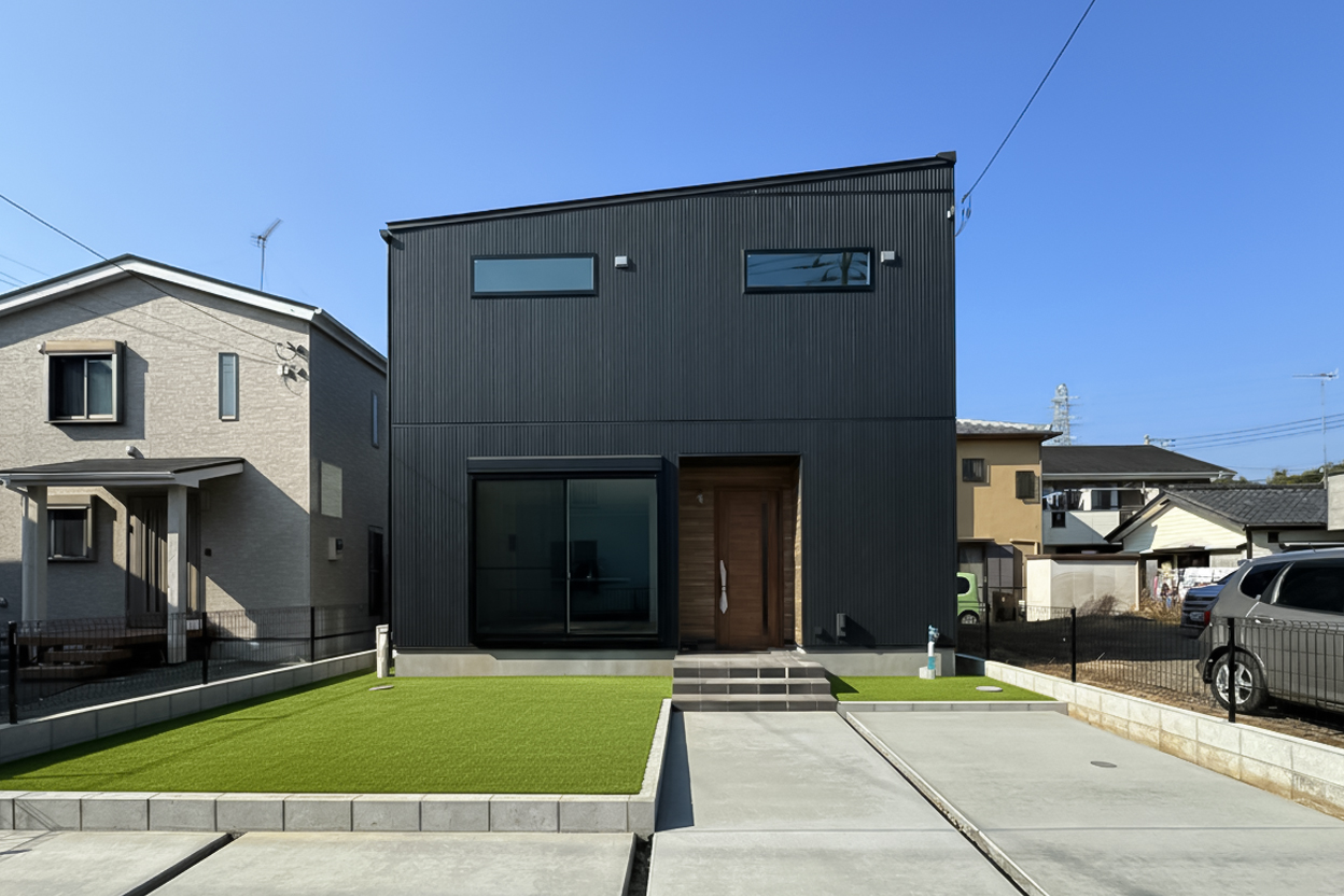 外壁のメインカラーにはブラックを採用。落ち着きのある色合いが建物全体を引き締め、重厚でスタイリッシュな佇まいを演出しています。