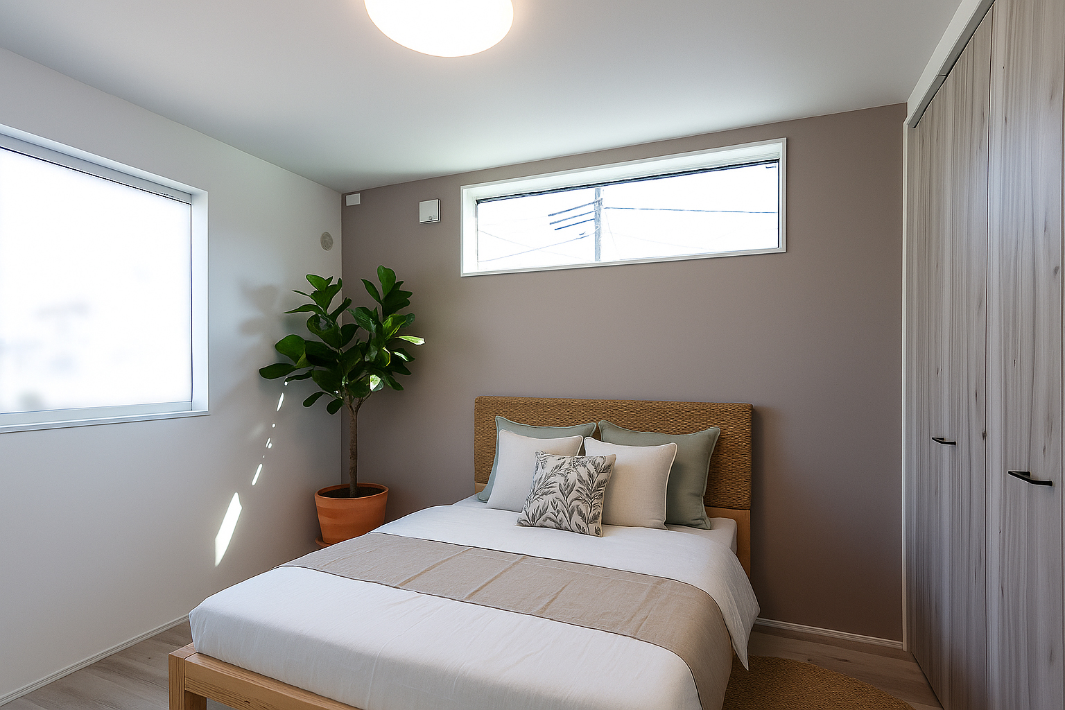 寝室には、落ち着いた色味のアクセントクロスを取り入れ、心を整えてくれるような空間に仕上がりました。やわらかな色調が壁面に奥行きを生み、穏やかな雰囲気の中で心身ともにリラックスできる、やさしい寝室空間となっています。