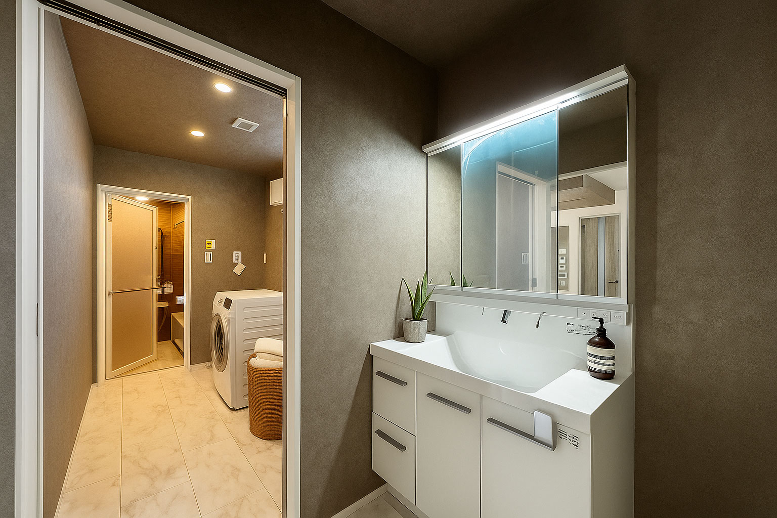 洗面化粧台にはLIXIL「EV900」を採用し、扉カラーは清潔感のあるホワイトで統一しました。壁紙にはシックなグレーを取り入れ、空間全体に落ち着いた表情と洗練された雰囲気を添えています。