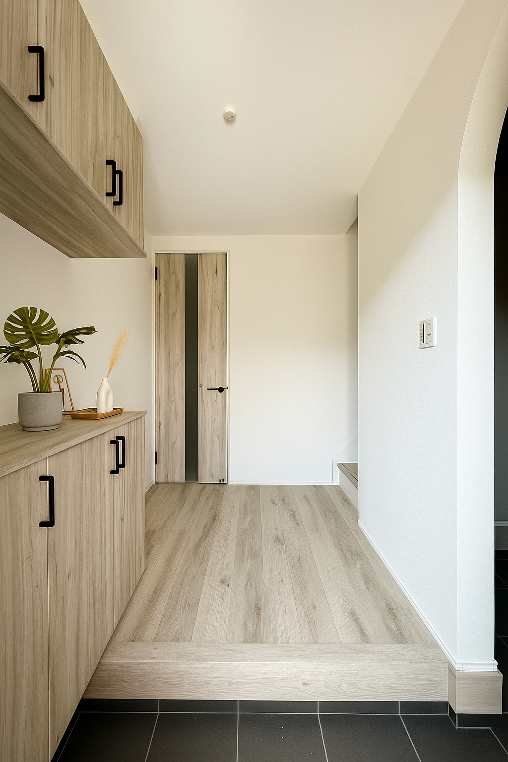 収納の色味が空間に奥行きを加えつつ、玄関全体をすっきりと見せてくれるため、広がりを感じる開放的な印象に。帰宅した瞬間から明るく迎えてくれる、清潔感と温もりのある玄関です。