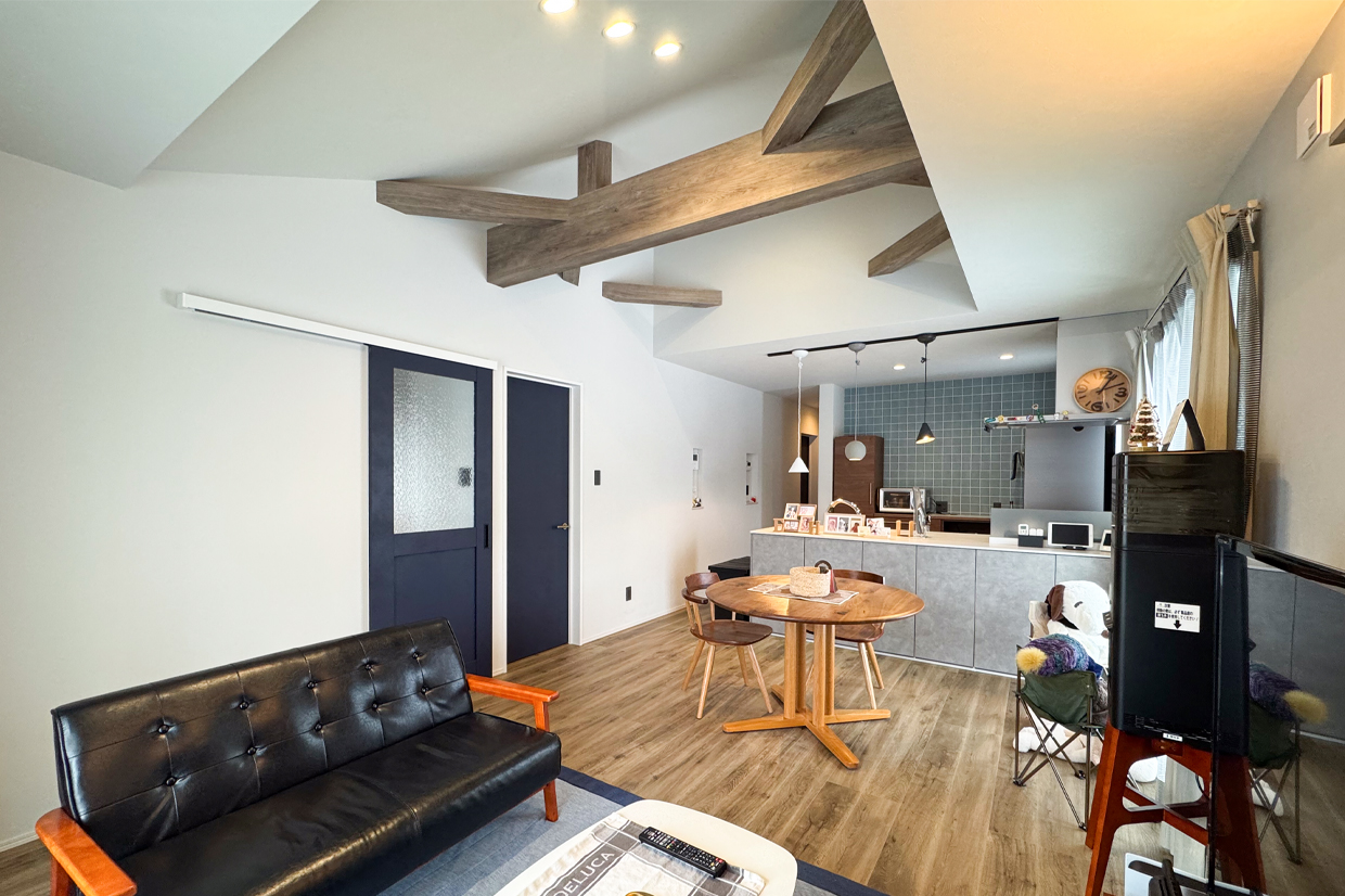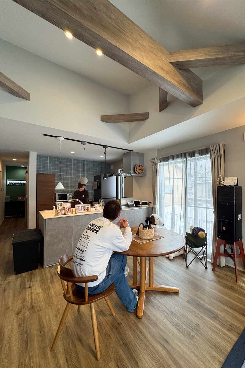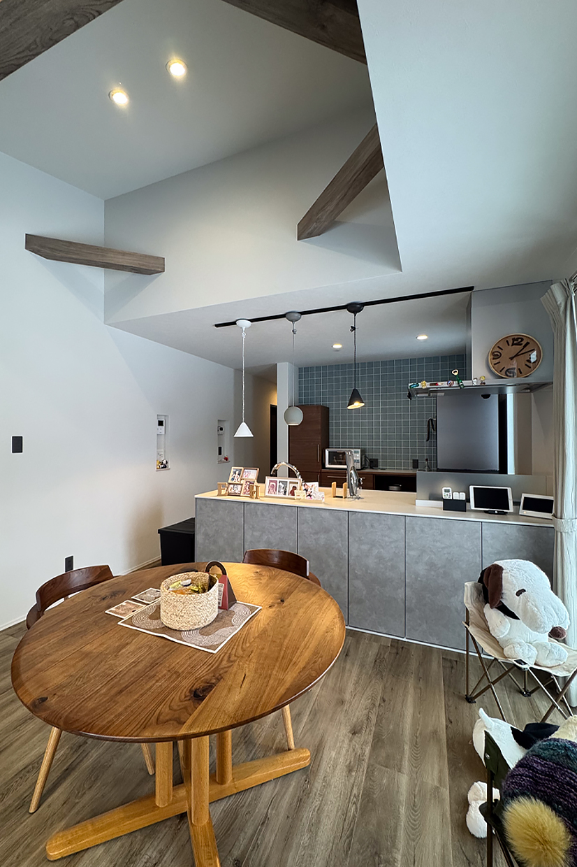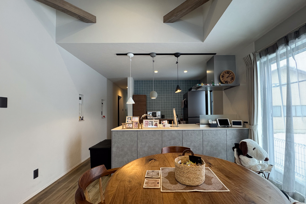 間取りを考える際は、自分たちらしい空間にしたいという想いからInstagramなどのSNSはあえて参考にせず、カフェや雑貨店などを参考にしながら、自分たちの感性も取り入れて空間づくりを進めていきました。キッチンの色合いを中心に、リビングのアクセントクロスや内装を決めていく中で、勾配天井も取り入れたいと考えていました。実際に完成してみると、リビング全体に開放感が生まれ、ソファに座りながら眺める、勾配天井からキッチンまでの景色は、お気に入りのひとつになっています。