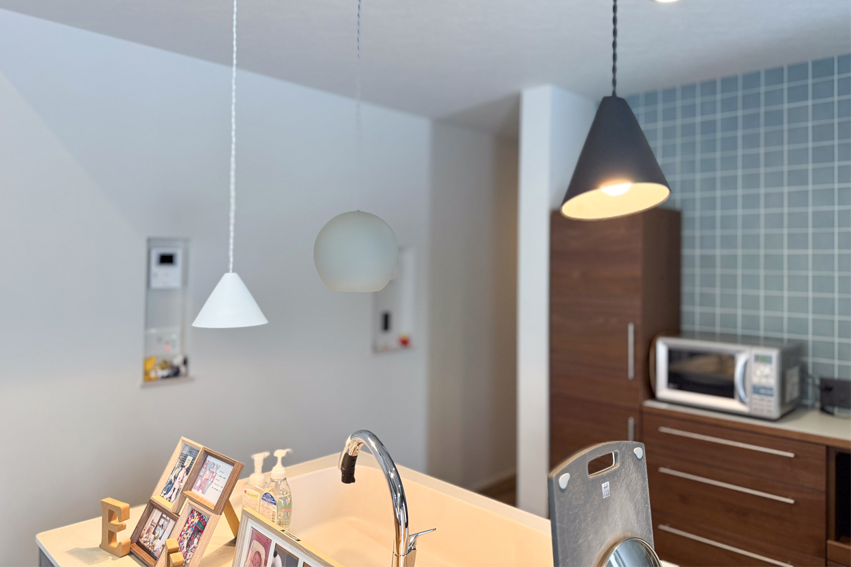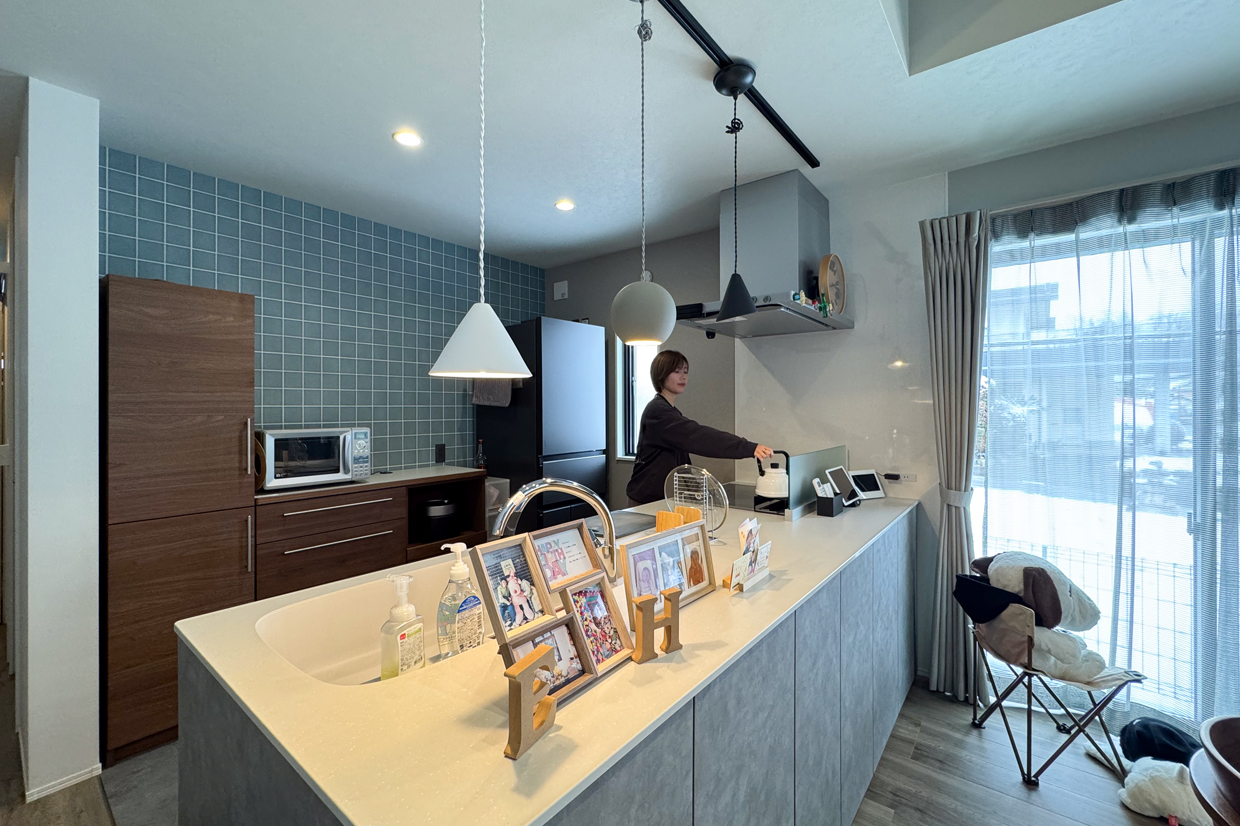 当初は、扉カラーを少しかっこいい印象のものにしようと思っていましたが、実際にいくつかのメーカーのショールームへ足を運び見学をしたところ、LIXILのシステムキッチンに出会って、収納力も良く、落ち着いたグレーの色味がとても上品で、こちらのキッチンを採用しました。結果的に、当初イメージしていた“かっこいい雰囲気”から、柔らかくて落ち着きのあるカフェのような空間になりました。