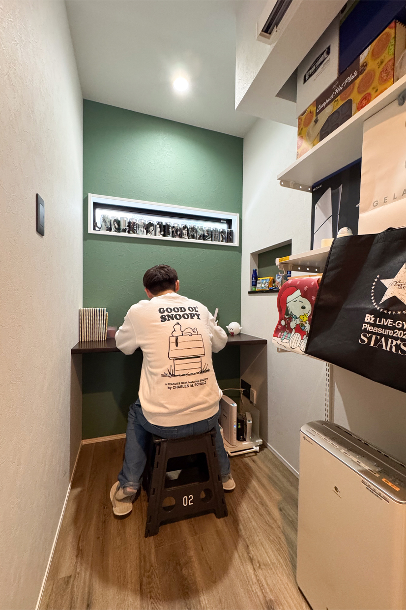 また、書斎の横にある収納棚は、設計の方から提案していただいたものです。洗面スペースの引き戸を閉めると使える収納になっていて、最初は、あまりイメージが湧いていませんでしたが、実際に完成した収納スペースを見てみると、使い勝手が良く、いろいろなものをしまえるのでとても良かったです。