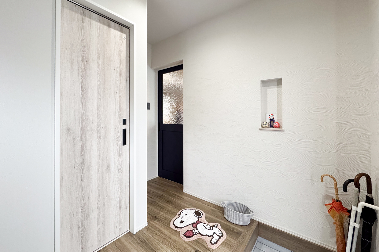 もともと日本庭園の枯山水が好きで、今回玄関の壁紙として採用しました。入ってすぐに目に入る位置に配置して、とても気に入っています。