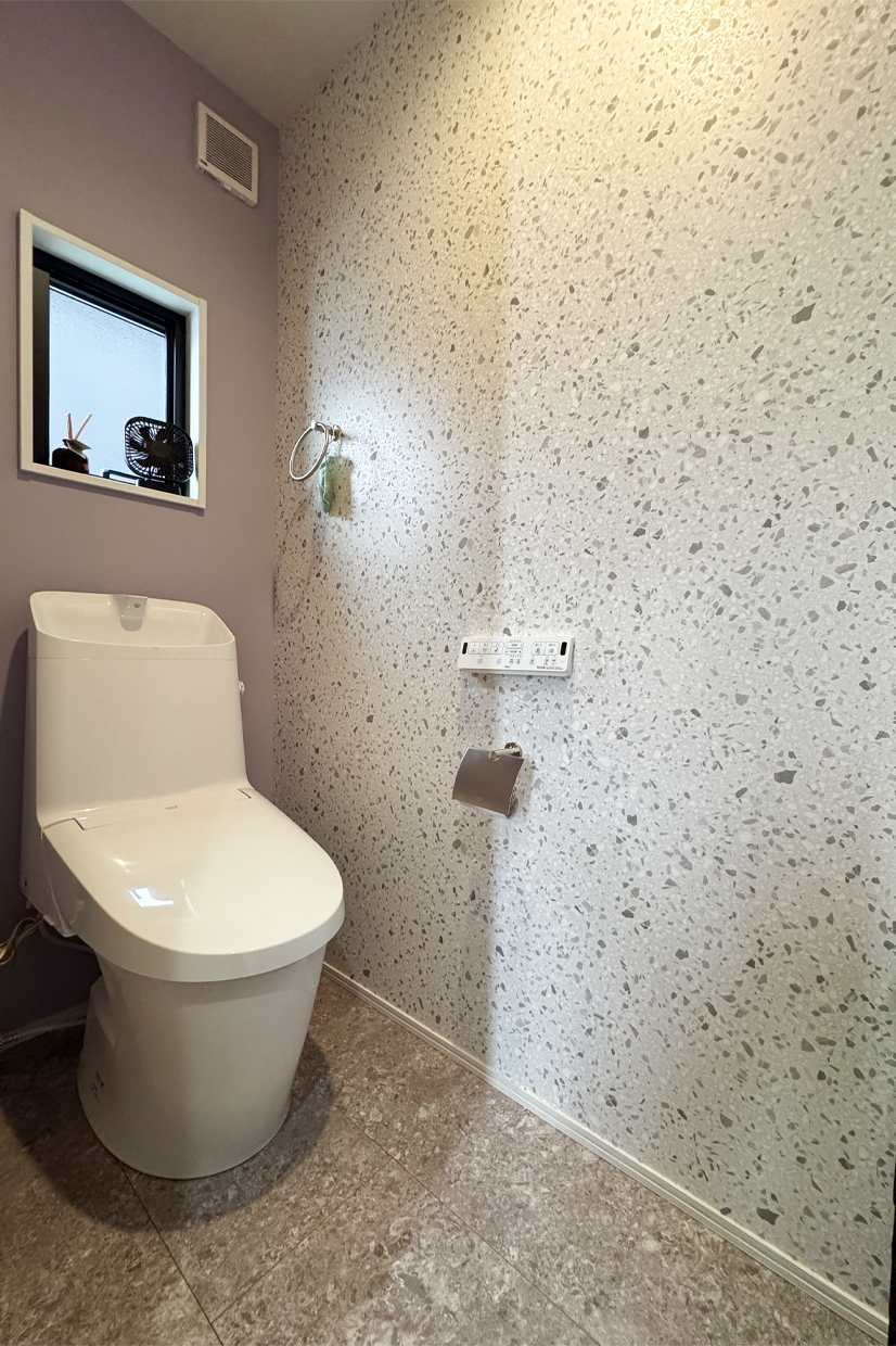 色合いもお気に入りで、玄関の枯山水と同様に、砂利をイメージした壁紙を採用しました。また、淡い紫色をアクセントとして取り入れ、やわらかい印象の空間に仕上がりました。